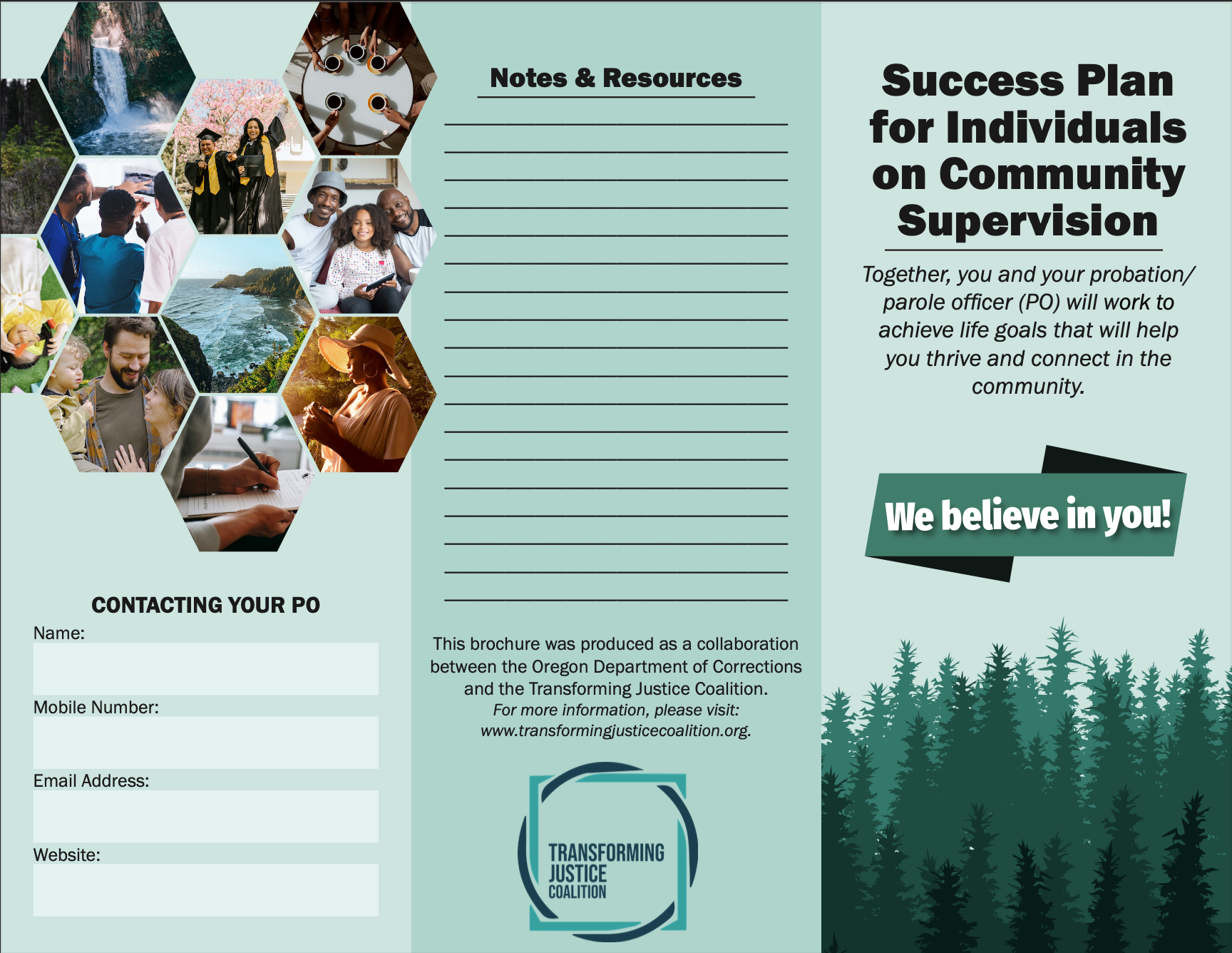 The Transforming Justice Coalition worked in partnership with the Oregon Department of Corrections to develop a brochure aimed at assisting people on probation and parole, alongside their officers, in creating a success plan. This initiative is designed to enable people to fulfill their supervision requirements effectively and adequately prepare for their reentry journey by utilizing the resources provided.